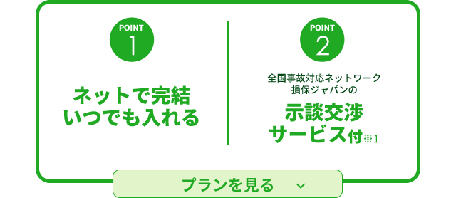 注1:示談交渉サービス付なので、日本国内の事故にかぎり、損害賠償に関する示談交渉をお客さまに代わって損保ジャパンがお引き受けします。